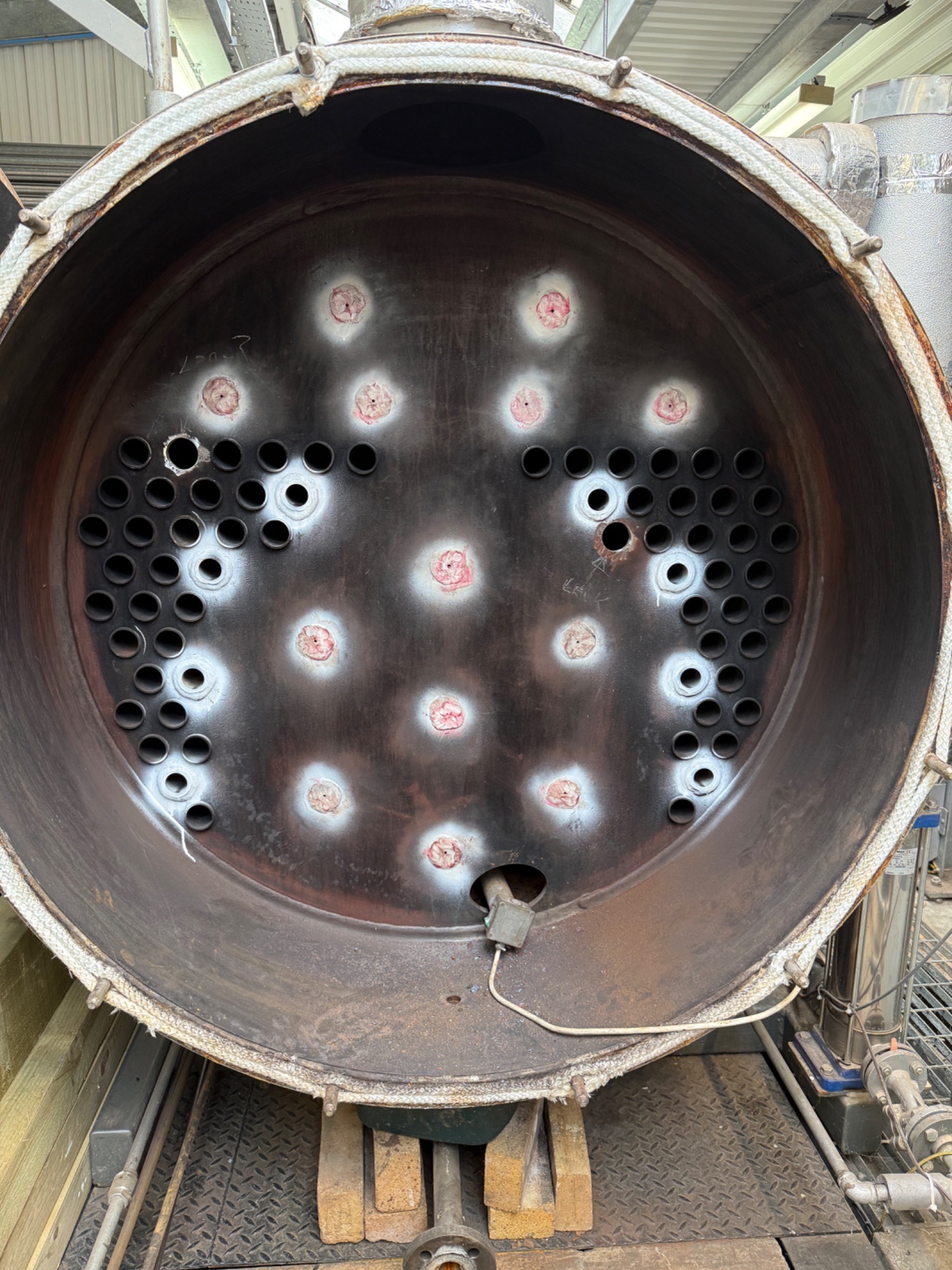 Initially two tubes on the boiler were leaking and required replacing. A fuller inspection suggested that all the tubes were reaching end of life and were corroded. Rather than facing piecemeal replacement a decision was made to replace all the tubes. This work is now underway and the photographs...